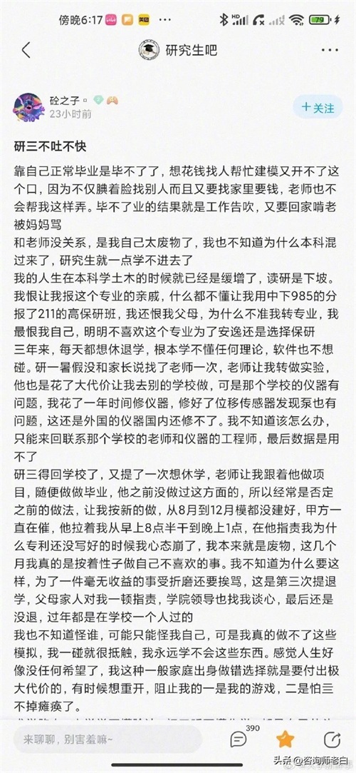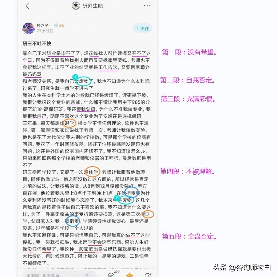 第五段:充满绝望。大学本科四年+研究生三年,一共七年时间,孩子因为不喜欢专业,一直生活在“自我否定、充满怨恨”之中,又“不被理解”,研究生毕业“没有希望”。帖子里满满的负能量,自己“永远学不会”,家庭“出身一般”。