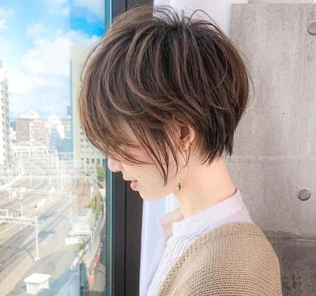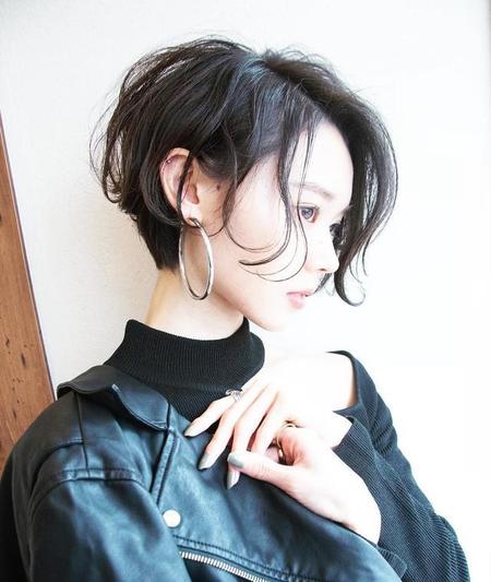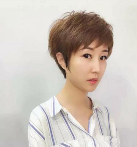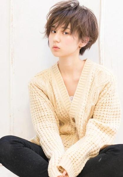 现在流行的狗啃式刘海短发发型,大都属于超短发的类型。因为顶部长度较短,所以发型会产生自然的蓬松感。顶部的高度增加对脸型的影响力也就增加。
