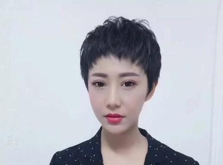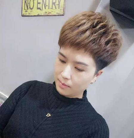 类似于男生发型的效果,两边剪短剪薄,顶部留长,做出蓬松自然的造型。这种发型超短发发型中比较常见也是偏中性化的发型风格。