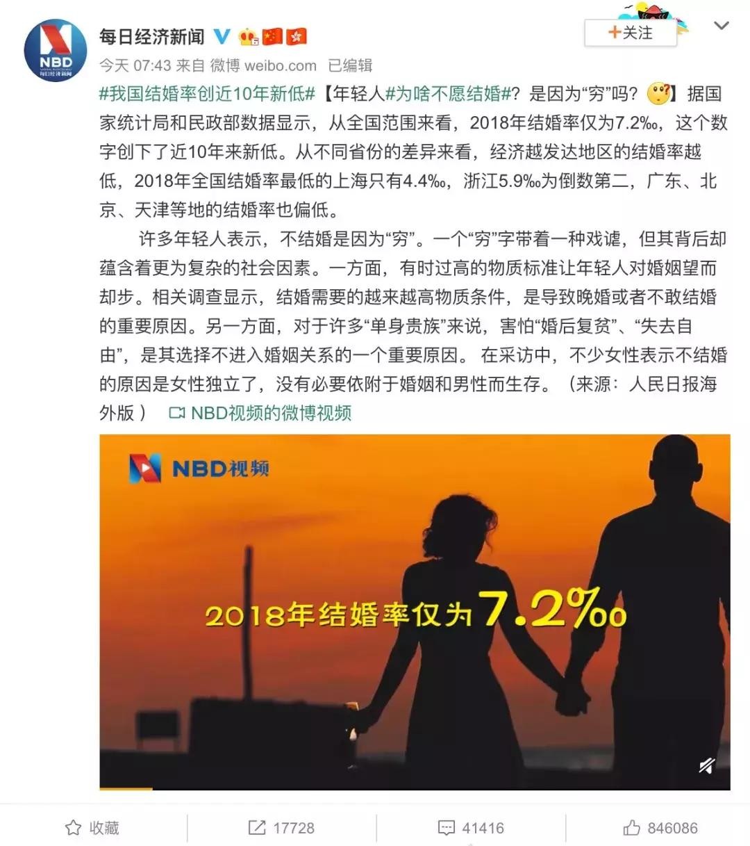 “从全国范围来看,2018年结婚率仅为7.2%,这个数字创下了10年来新低。”