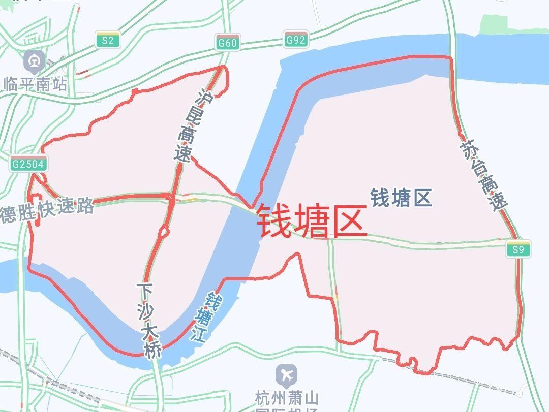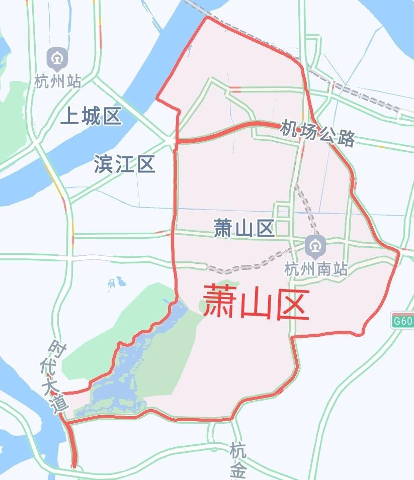 时代大道(万达路-义桥高速出口)-亚太路(不含风情大道-0省道)-03省道(不含)-大南线(不含)-塘湄线(不含) -塘新线(不含)-104国道(不含)-钱塘江南岸江堤路-利民河-文明路-风情大道-越王路-湘湖路围合成的区域