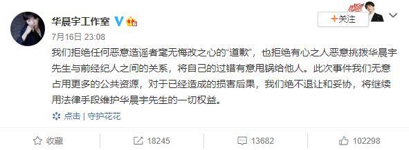 16日深夜,华晨宇工作室就该网友的道歉,直接表明了态度,继续用法律手段维护华晨宇一切权益