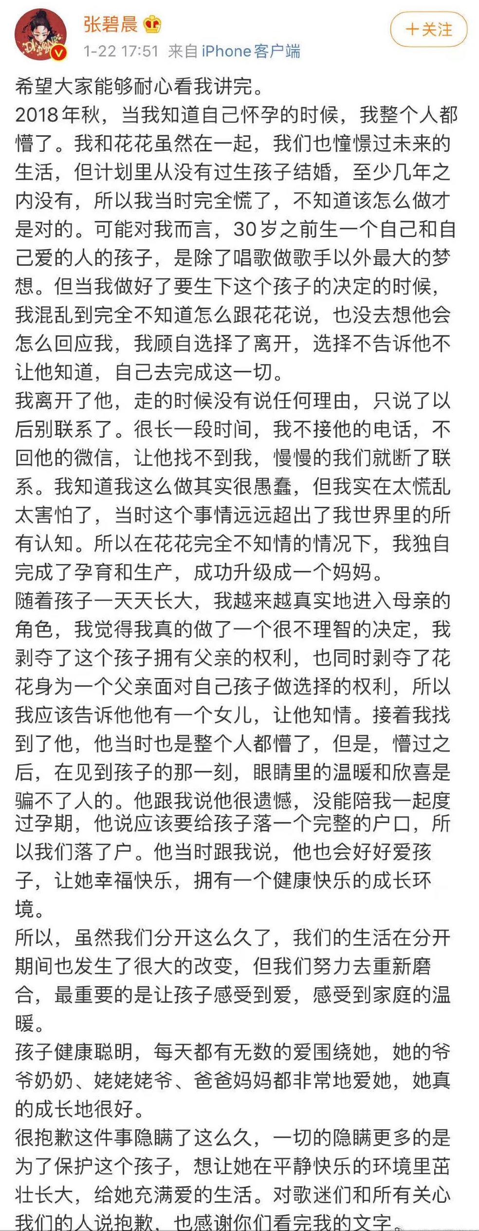 1月22日,张碧晨和华晨宇两人就发文承认两人共同育有一个孩子,张碧晨更是发了一部短片小说来描述两人的故事,说实话,比小说写的更好看,