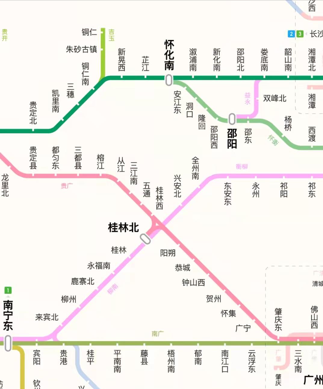 桂林北站,主要线路:贵广线、衡柳线,站台规模:9台18线,预留怀桂高铁场扩建