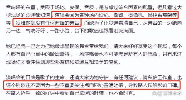 粉丝吐槽声量扩大后,邓紫棋吧官博发布长文解释,称演唱会受限场内设施等情况,很难做到没有任何遮挡的舞台,而邓紫棋已经很努力让大家看清她了。还有也请粉丝不要公开吐槽宣泄,破坏路人口碑。