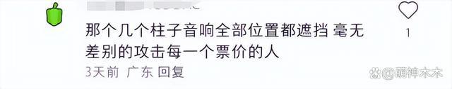有粉丝直言演唱会整晚看了条铁,不仅侧面视角遮,舞台中央正面镜头也被音响柱子遮住,完全看不清歌手样貌。从她晒出的现场图可以看出,舞台上放置了三排音响长柱,每一根柱子与荧幕上的画像完美贴合,非常影响观众体验。