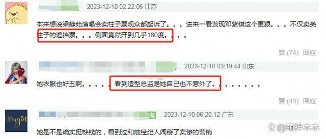 而普通网友看到邓紫棋这番操作也是不可置信,认为为了赚钱鼠目寸光。早先梁静茹就因卖演唱会柱子票被观众起诉,而邓紫棋这是有过之而不及,不仅卖遮挡票,还侧面平开到接近 180 度。至于服装设计老土的问题,鉴于设计总监是她本人也并不意外。