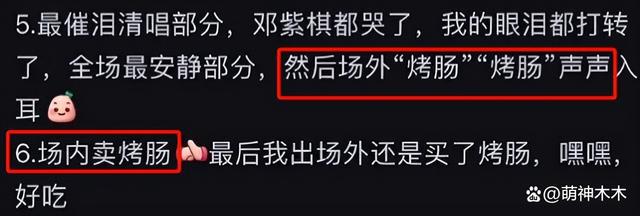 还有粉丝称演唱会内场还售卖烤肠,在全场最催人泪下的环节,邓紫棋都哭,结果烤肠的叫卖声不断入耳,非常破坏意境。