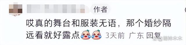 关于服装选择,有的网友觉得老土,像十几年前的审美,也有网友吐槽婚纱那件还不安全,远看起来像露点。