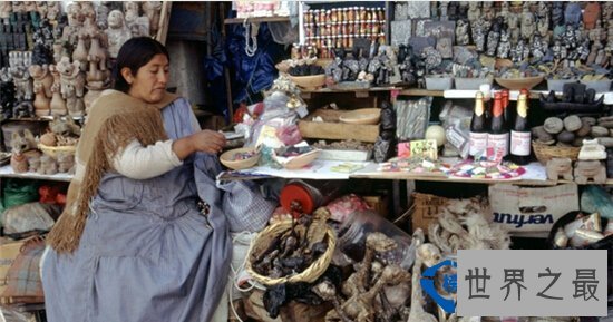 在南美洲玻利维亚的拉巴斯,这个号称是世界上就高的都市,有一个极其怪异的街市。在这条街上尽是女巫、占星家、算命者、巫师这样的人。集市上卖的东西尽是些诸如弄干了的蟾蜍、猫头鹰的羽毛、护身符等东西。在玻利唯亚,家家户户都挂一个干了的骆驼胎儿在门口。他们觉得这样就可以招来好运。