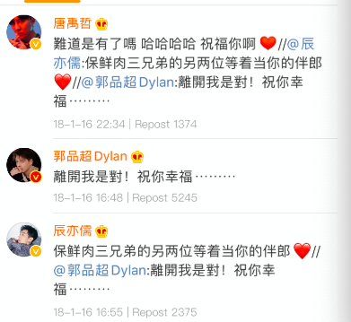 之后汪东城的好友郭品超、辰亦儒、唐禹哲看热闹不嫌事大,纷纷转发送上了祝福,就连汪东城的经纪人也是模糊回应,称希望给艺人空间。