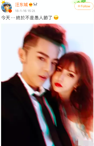 不过后来网友在看清日期后,反应了过来当天原来是愚人节,就没把这件事放在心上。没想到在18年1月16日,汪东城再次发出一张和藤井莉娜的亲密自拍照,并配文“今天终于不是愚人节了”,疑似公开了恋情。