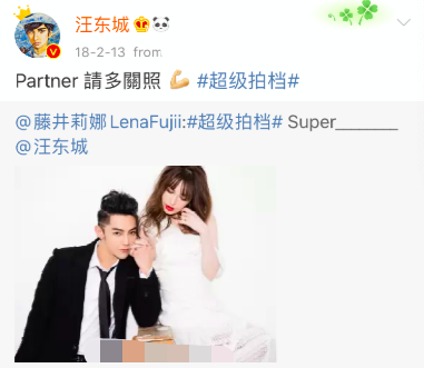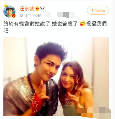 2013年4月1日的时候,汪东城突然发出了一张自己和藤井莉娜的自拍照,并写道“终于有机会对她说了,她也答应了,祝福我们吧”,瞬间惊呆不少网友,以为汪东城公开了恋情。