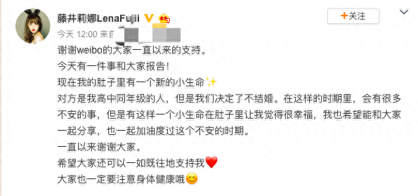 35岁藤井莉娜官宣怀孕,直言不会和男方结婚,曾和汪东城传绯闻