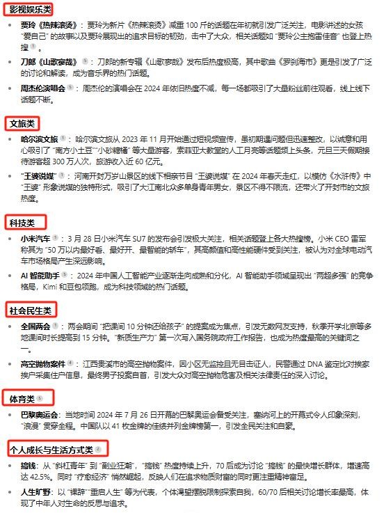 总结火爆话题主要集中在:影视娱乐类(贾玲《热辣滚烫》、刀郎《山歌寥哉》、周杰伦演唱会)、文旅类(哈尔滨文旅 、“王婆说媒” )、科技类(小米汽车、AI 智能助手)、社会民生类(全国两会、高空抛物案件)、体育类(巴黎奥运会)、个人成长与生活方式类(搞钱、人生旷野)6类热点话题。