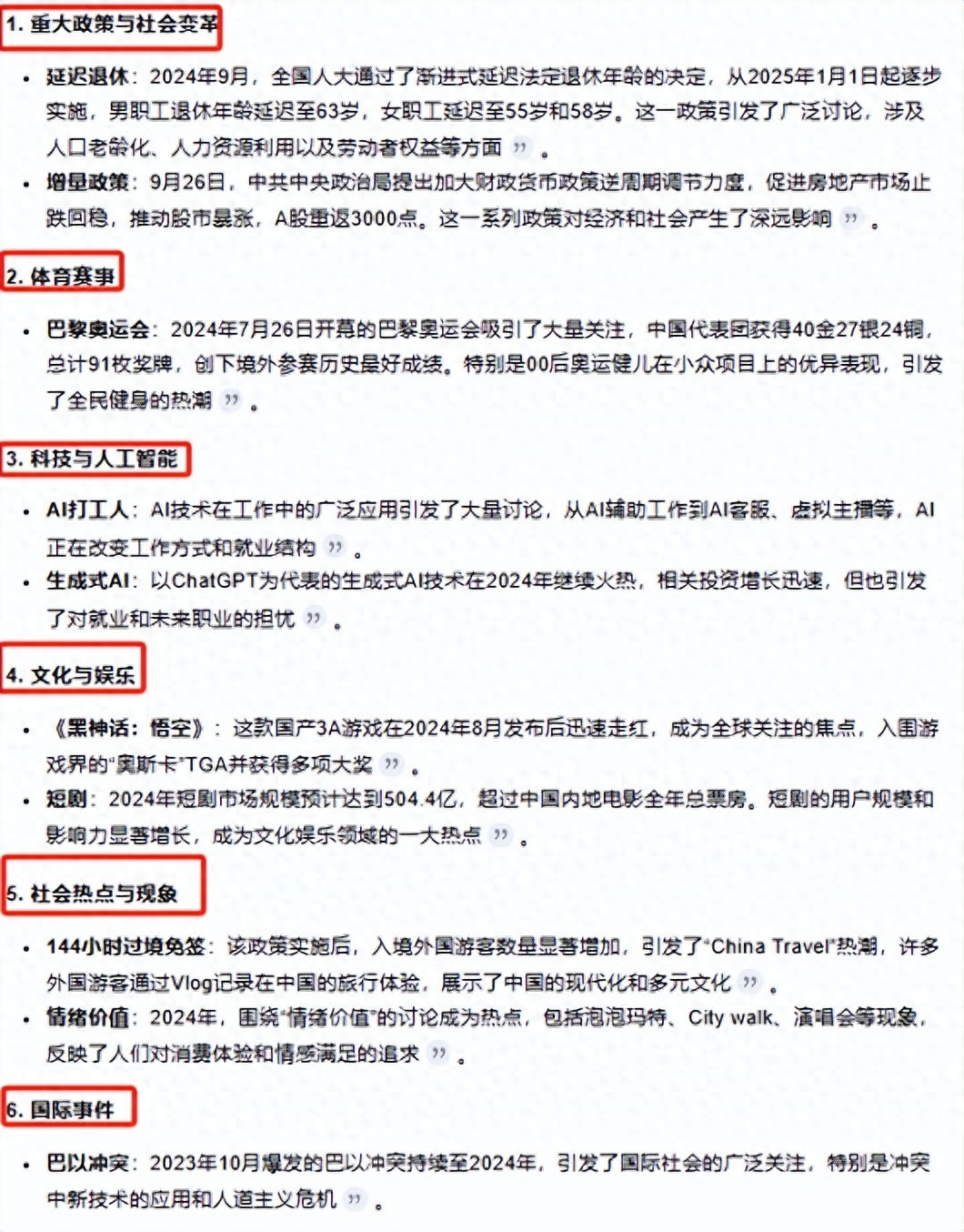 总结火爆话题主要集中在:重大政策与社会变革(延迟退休、增量政策)、体育赛事(巴黎奥运会)、科技与人工智能(AI打工人、生成式AI)、文化与娱乐(黑神话:悟空、短剧)、 社会热点与现象(144小时过境免签、情绪价值)、 国际事件(巴以冲突)七类热点话题。