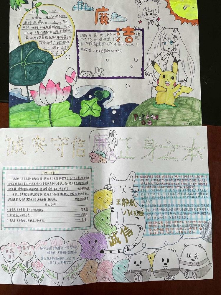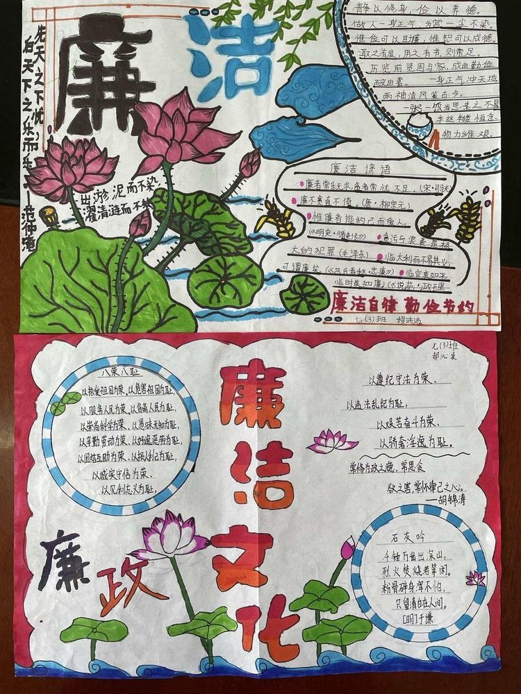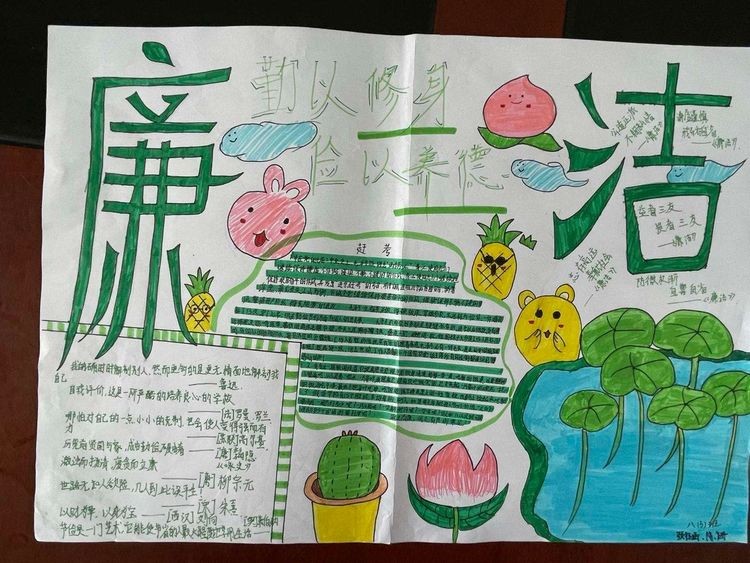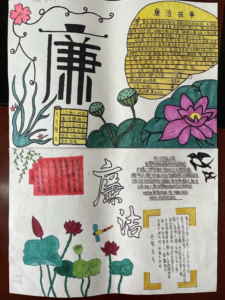 本次手抄报以班级为单位,各班班主任积极组织学生利用课余时间,围绕“敬廉崇洁”这一主题,创办了一张张布局合理,标题醒目,创意新颖,图文并茂,内容丰富,色彩灵动的手抄报作品,紧扣校园廉政文化主题,揭示教育警示意义,使学生在润物无声中受到了教育。