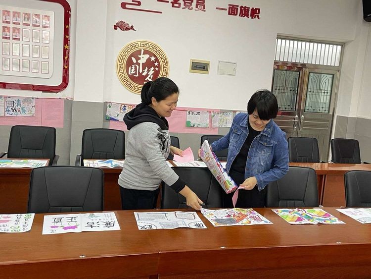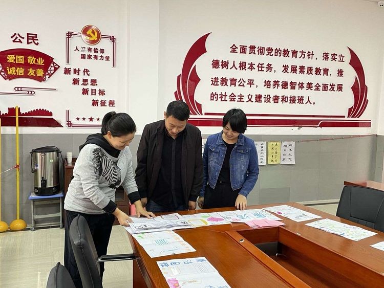 於红星副校长、美术教研组成员肖凡、史乐乐两位老师对参赛作品进行评比打分。