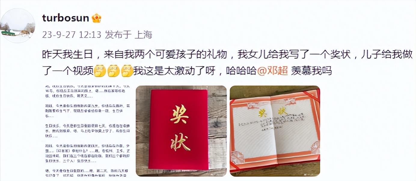 9月27日,演员孙俪在个人社交平台上晒出了自己的生日礼物,没有像往年一样在生日当天就发出全家福的照片,而是在生日隔天孙俪才晒出了来自儿女们送给自己的暖心礼物。孙俪在文末还特意艾特老公邓超在线询问:“羡慕我吗”,哈哈哈估计超哥看到自家老婆的动态,都要羡慕哭了吧。