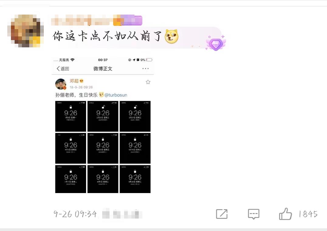 原来,邓超为了给孙俪庆生,想要卡9点26分截屏给孙俪发送祝福,为孙俪献上自己最特别的心意。然而,祝福发表后发现竟然晚了一分钟。