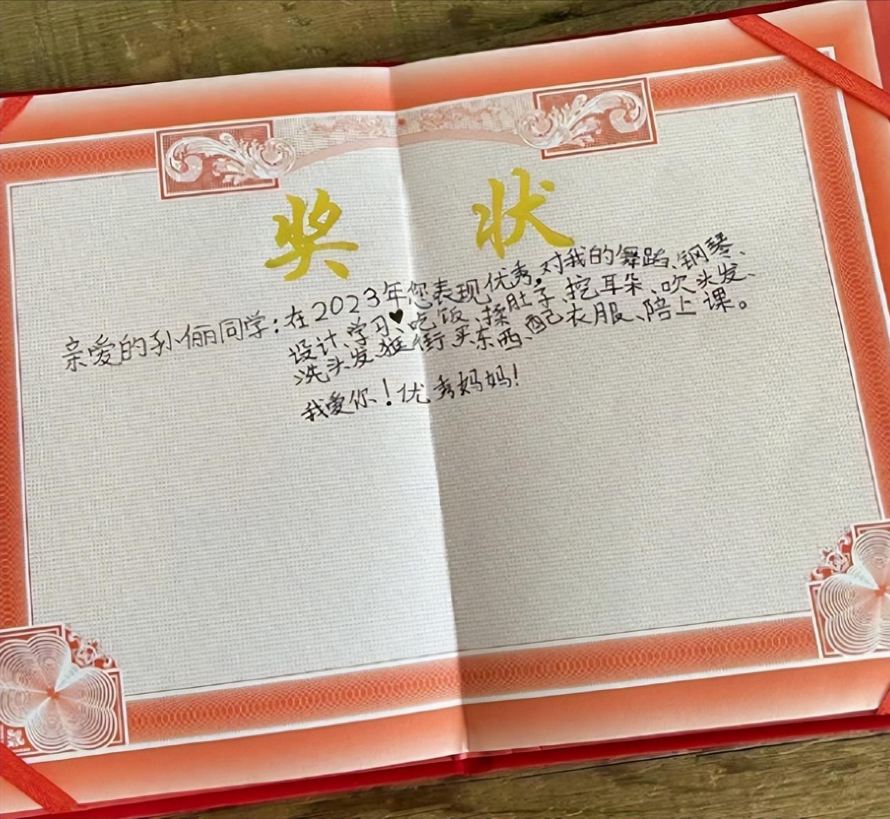 据孙俪发文所表述的,女儿小花送的是一本手写奖状,孙俪也是美滋滋的晒出这本奖状,真的是隔着屏幕都能感受到来自老母亲的幸福。在孙俪的分享中可以看得到,妹妹小花给妈妈的奖状非常有仪式感,奖状全部都是小花手写的。小花还称呼妈妈为“孙俪同学”。