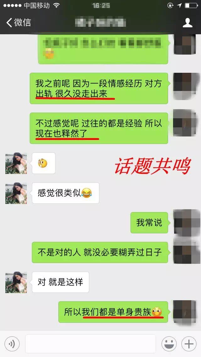 虽然例子有点不可思议,但要的就是这种效果。第二步:互相吸引理想状态:共性认同。适用技巧:深度话题共鸣,缺陷合理化,隐性价值展示如果你有任何恋爱情感的问题、学习正确的聊天方法、追到喜欢的女孩。可以添加我的微信()我会对你的任何情感问题进行答疑,并给予你可行的意见。同时,微信朋友圈大量的聊天技巧和追女孩技巧的分享可以免费学习。1.深度话题共鸣