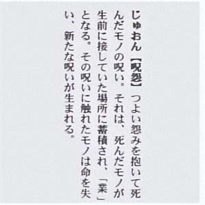 この呪いの死者は重大の恨みから。それは死の地方を积み立てて彼の恨み。さわるからこの呪いの人が死んで、新しい呪いが诞生する。