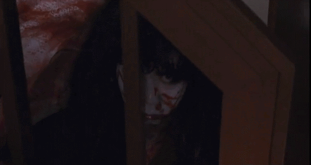直到《咒怨》Tv版的五十三分钟左右,伽椰子的真实模样才展现在观众面前。在此之前,她在屏幕中一直以模糊的镜头和阴影的方式呈现。当我们看到她的全貌时,电影只剩下17分钟了。她第一次以更具直观冲击的恶鬼形象出现的过程是非常观看值得的,在这场戏中,她缓慢裹着塑料袋爬下楼梯,塑料袋摩擦的声音,骨头开裂的声音,嘴里发出可怕呃呃呃的声,加上身后俊雄的存在,这一幕恐怖至今让人难以忘记!然而,由于不是很明亮,它并不能完完全全很好的展现出来。但清水崇选择以这种奇怪的方式拍摄这一恐怖场景,因为从阴影中爬出来的伽椰子比她在高亮背景下爬出来要可怕得多。