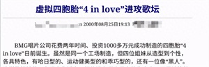 2000年,一个打着四胞胎旗号的“4 in love”组合横空出世。当时有媒体对于这个组合的四个小女生的评论是,各具特色,其中一个还像“黑人”。