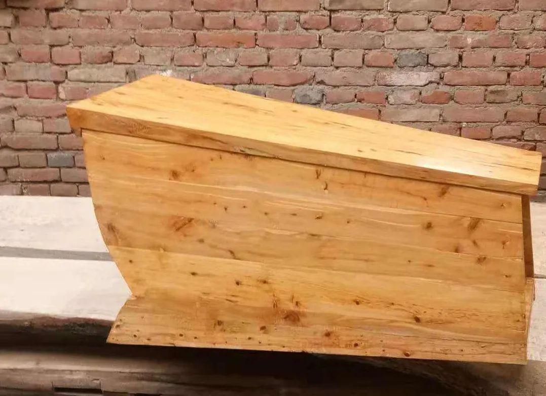 中原地区的棺材外形非常奇特,前端大,后端小,呈梯形状。匠人所用的每一块板材都是斜面,棺材成形后,也是一个前大后小的形状。做棺材的材料都是斜货材料,两个立帮和盖顶也是前宽后窄,从棺材的前头正面看,整个棺材好像一个大型的木匣子。