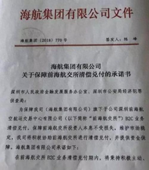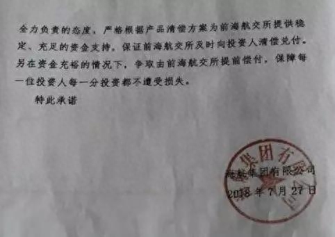 “一开始被单方面告知收益率都按6%算,本金分期兑付,我们也认了,想着好歹海航还在。可没想到,如今就连海航兜底也不能保证能拿回自己的本金。”有投资者向券商中国记者出示了一份加盖公章的承诺书,海航承诺在前海航交所B2C业务清偿兑付期内,将严格根据产品清偿方案为其提供稳定、充足的资金支持,保证前海航交所即使向投资者清偿兑付。另在资金充裕的情况下,争取由前海航交所提前偿付,“保障每一位投资人每一分投资都不遭受损失”。