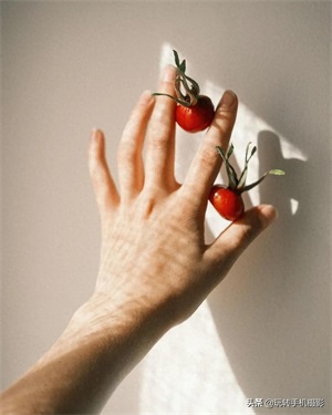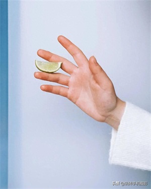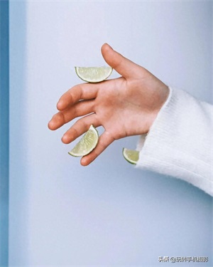 例如,下面这3张照片,以白墙为背景,人物伸手入镜,置于画面对角线处,将青柠檬块、小番茄放到指尖夹缝里。这一小创意点亮手部特写照,给人带去新颖的视角。