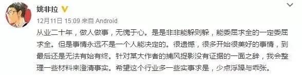 面对大家一拥而上的指责,「反派男一号,邪恶大 Boss」姚非拉目前发了两条微博,一条说自己会整理一些材料来澄清事实。