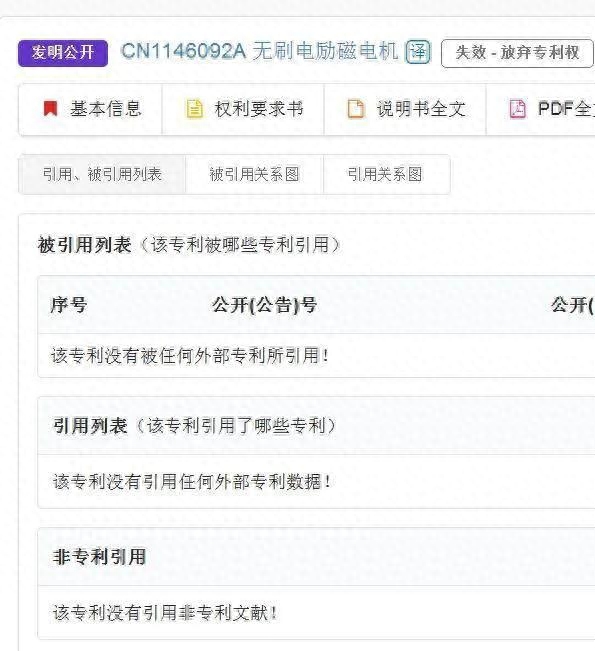 如果说李洪涛的专利“无刷励磁电机”是一个开拓性发明,那么其必将被以后的专利所引用,在后的专利肯定是在他的技术上进行的改造,但是经过我检索发现,被没有发现该专利被其它专利引用的记录,哪怕一条也没有。