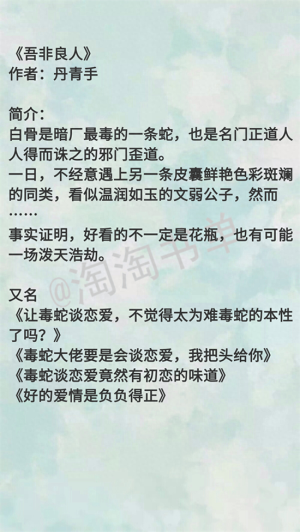 丹青手的小说,真的可!但个人还是觉得她的古言比现言出彩,现言感觉读起来怪怪的。最喜欢她的《吾非良人》,有同款伪片花,真的精彩。是难得的淘子能看下去的偏武侠江湖类的。上一本看的还是《一寸相思》,哈哈哈。好了,下面开推。