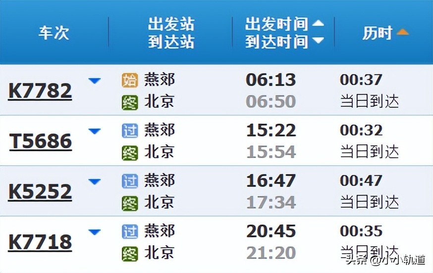 目前,燕郊至北京每天有4个车次的普速列车,即K7782次、T5686次、K5252次和K7718次列车。