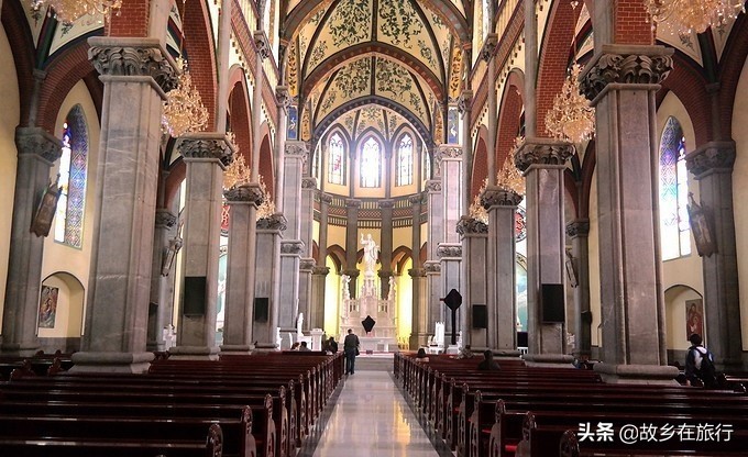 从大门进去,就能看到教堂的主楼,雄伟高大,气势磅礴,颇具宗教的神秘。是心灵休息的绝佳场所。洪走进教堂有一种安静、神圣、庄严的氛围,家楼天主教堂主厅中央通廊高大,进深很长 。天主教信徒们都很有秩序地径直走到一排排红色连椅上坐下,虔诚而专心地听神父讲解道义,净化心灵。