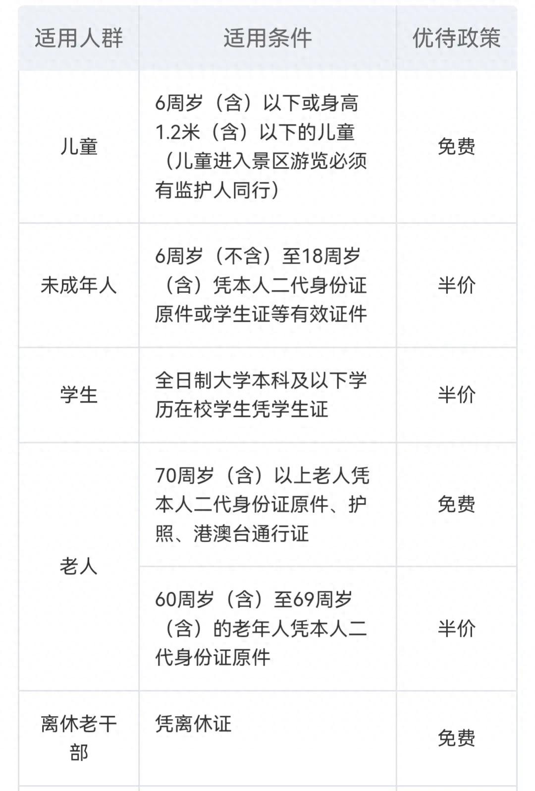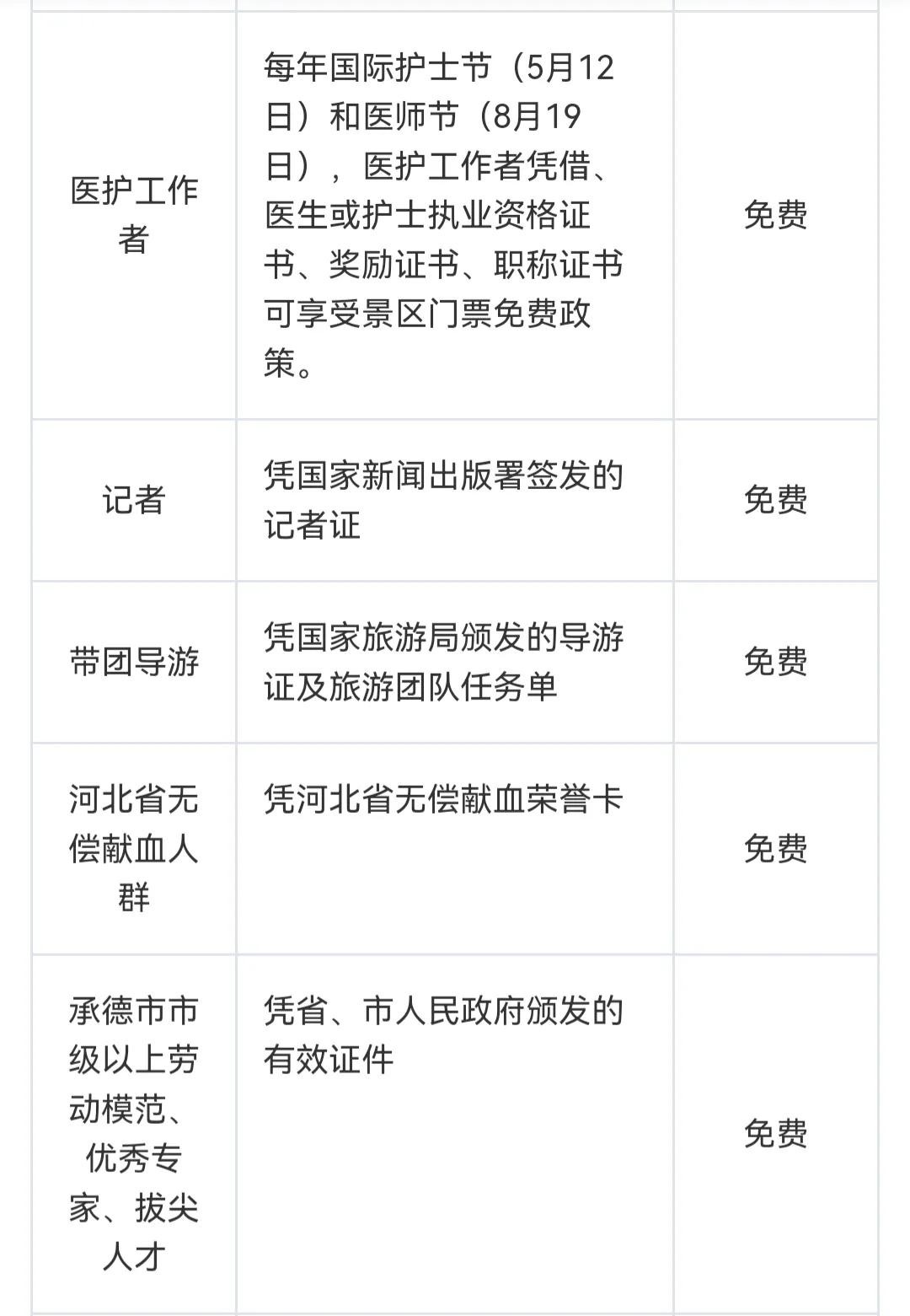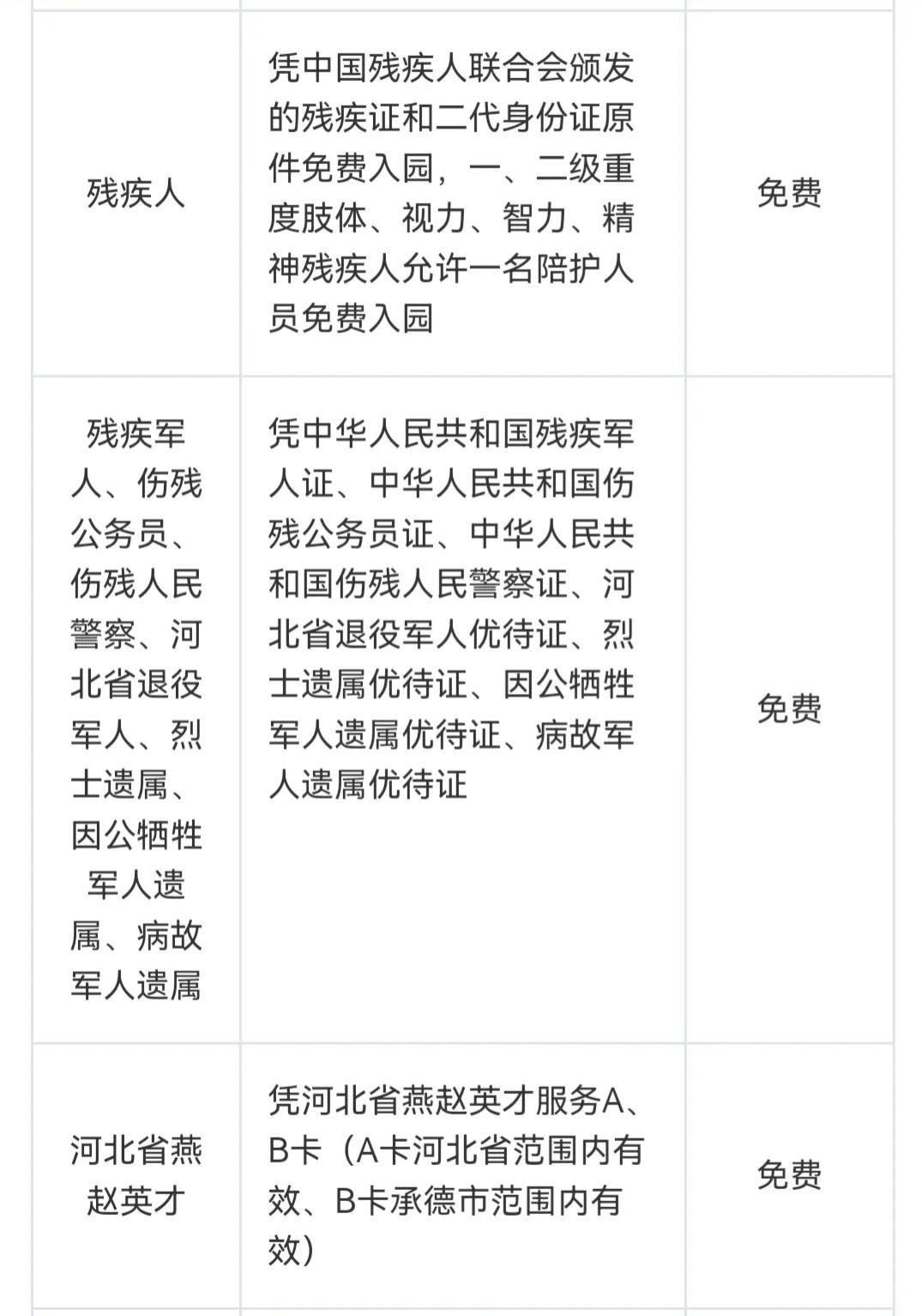 承德避暑山庄门票免票政策,图表显示14类人员可免费入园