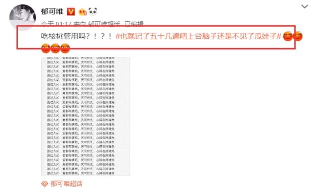 为此,郁可唯本人也进行了回应,9月9日凌晨,郁可唯发微博写道:“吃核桃管用吗?”“也就记了五十几遍吧,上台脑子还是不见了瓜娃子”,激动连四川话都说了出来。