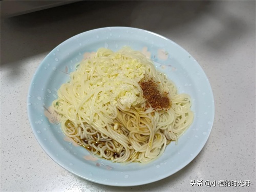 ④加入切好的蒜末,少许辣椒面、盐、味精、生抽、醋、麻油