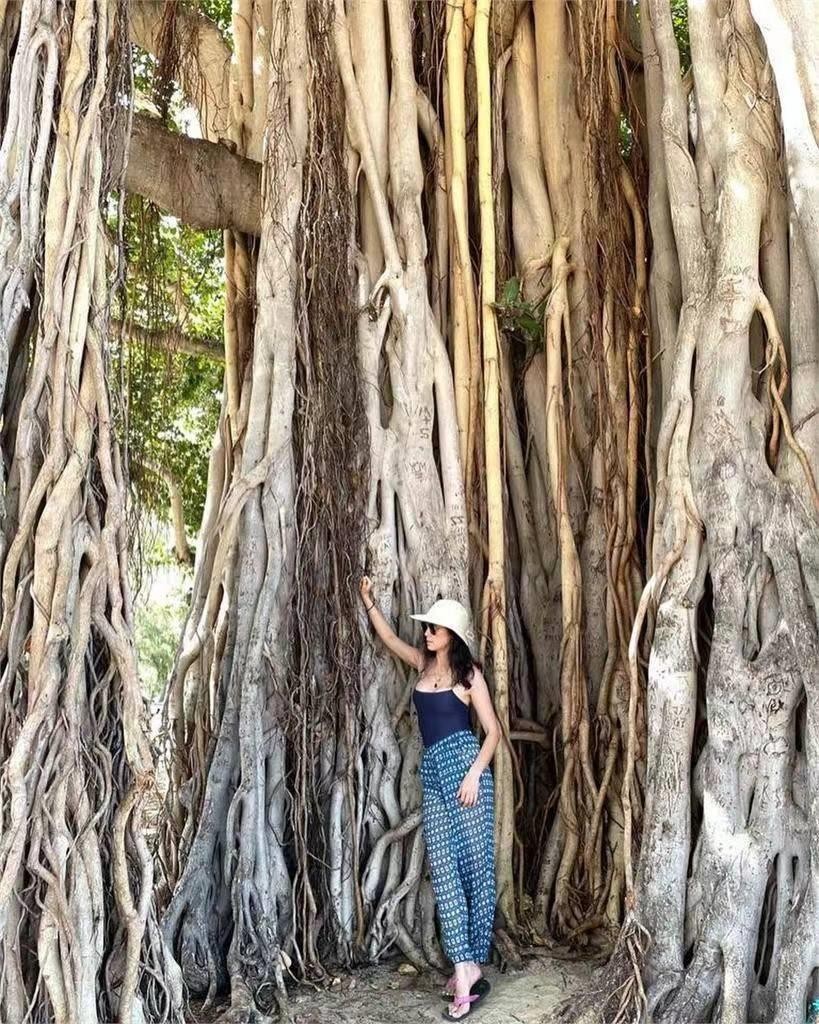 同时,林熙蕾还戴着一顶草帽和墨镜,在大树前方摆POSE拍照,心情看起来相当惬意自在。