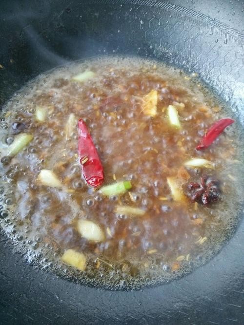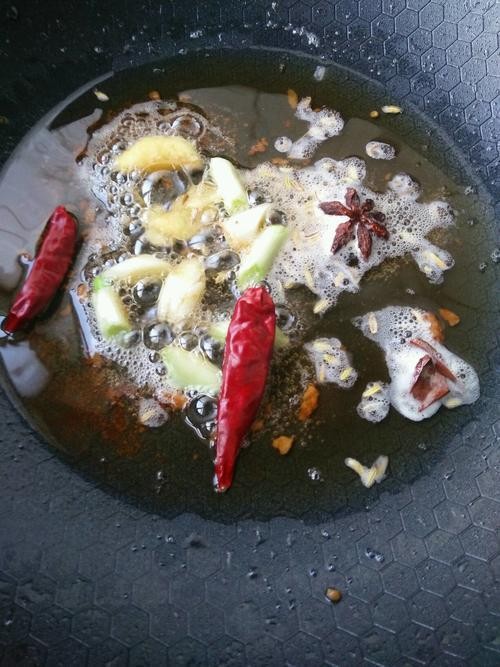 7.锅里剩一点儿油放入干红辣椒,花椒八角,小茴香,葱段姜片炒出香味