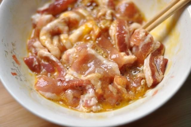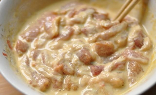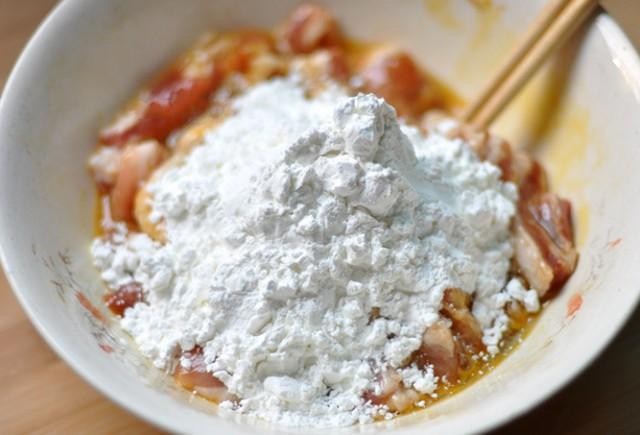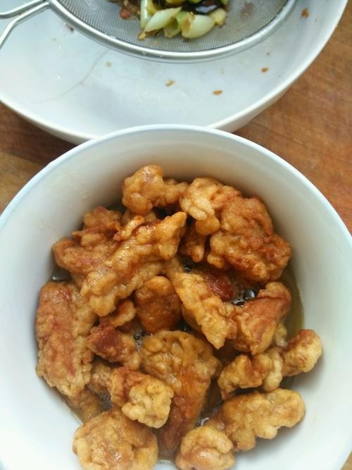5.油温七成,放入裹了蛋糊的肉块
