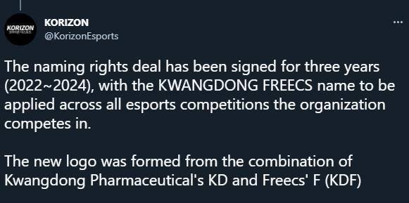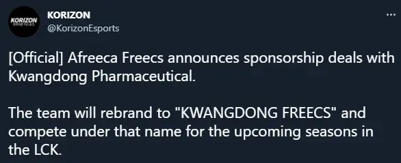 据悉,Afreeca Freecs战队和Kwangdong制药的冠名赞助合同将持续三年,在此期间,Afreeca Freecs旗下的所有分部都将更名为“Kwangdong Freecs”,目前该队伍的官博队标已更换。