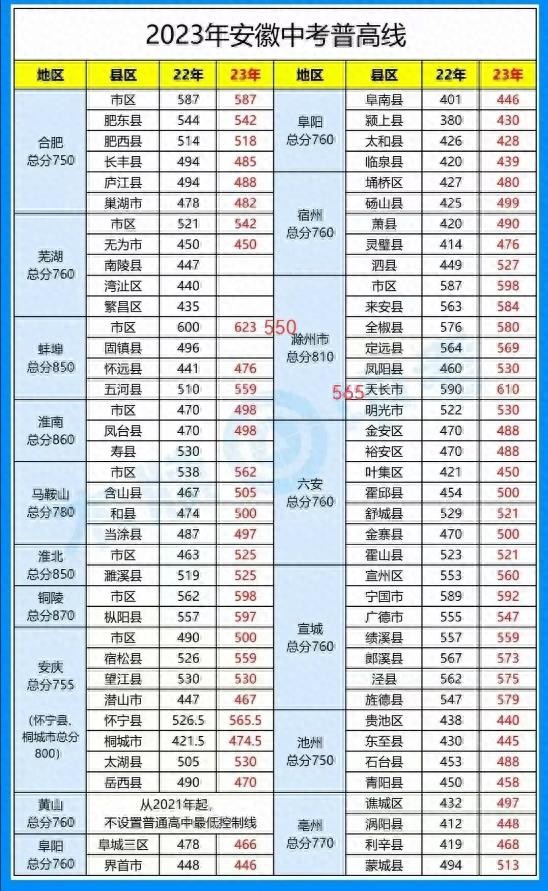 安徽各地的中考成绩已经公布,由于各地总分不太一致,把蚌埠和天长市的分数按总分750换算一下以便与合肥作比较,这样一比合肥市区的录取线还是全省第一。