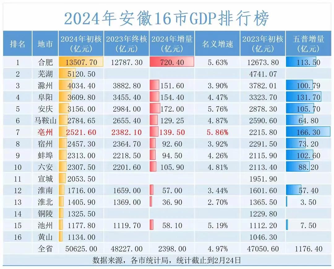 2024年安徽各市GDP排名:芜湖突破5000亿,亳州第7,黄山垫底