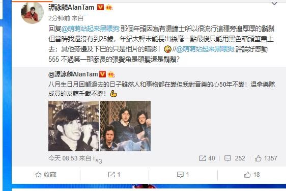 其中有一位粉丝还留言评论说:评论好感动555,不过第一那么长的长鬓角是头发还是胡子?谭咏麟看到后回应说:那个年头因为有金钟士所以很流行这种旁边厚厚的胡子但当时我还没有到25岁,年纪太轻还没有能长出丝毫一点最后只能用黑色象头笔画上去;其他旁边及下巴的只是相片的暗影!