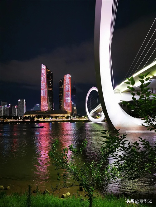 这一切都在波光粼粼的江水和依依垂柳的映衬之下,飘逸灵动中透着夜色的神秘,好一幅现代江南美画图,可谓:“逶迤带绿水,迢递起朱楼。”