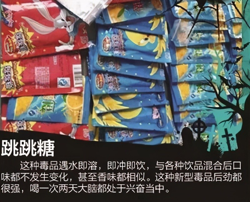 3、跳跳糖:跳跳糖可能是许多8090年代人的童年回忆,但这里指的跳跳糖,是一种伪装。这类毒品包装上都配着可爱的卡通形象,整个包装与市场上卖的跳跳糖无异。打开后无论是颜色和颗粒状,看上去真的很「跳跳糖」。但使用后会一直处在一个较为兴奋的状态中,长时间使用有成瘾的可能。