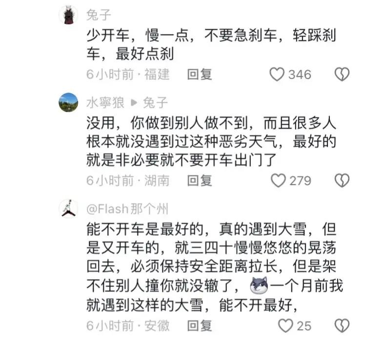 “这种规模的车祸在我们南方很少见,我被吓到了。”一位女司机表示,这次事件让她认识到,在陌生的道路条件下开车必须格外谨慎。她表示今后遇到大雪天气一定不会冒险驾车出行了。